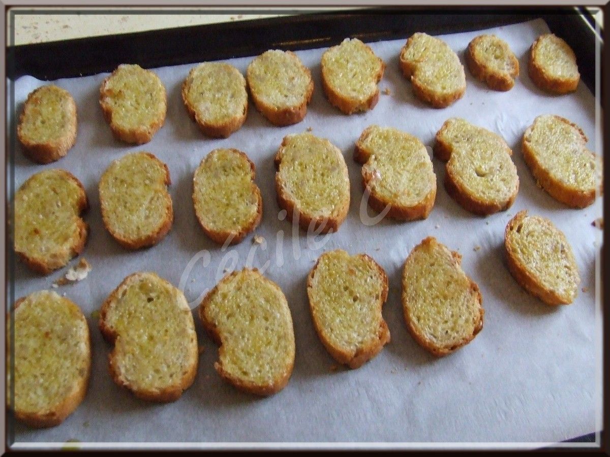 Couper de fines tranches de pain (maximum 5 mm d 'épaisseur). Vous pouvez garder de grandes tranches comme ici ou alors recouper en petits morceaux.