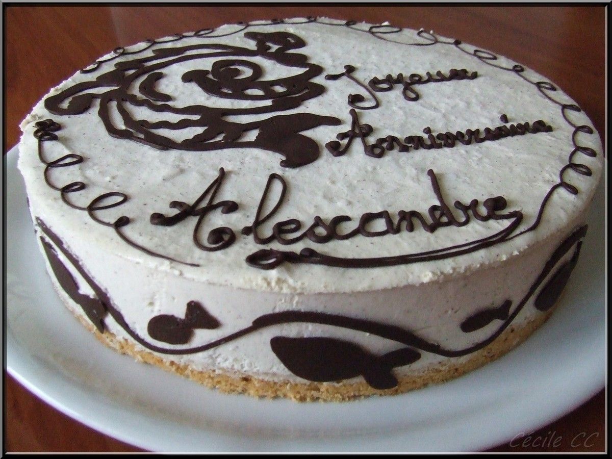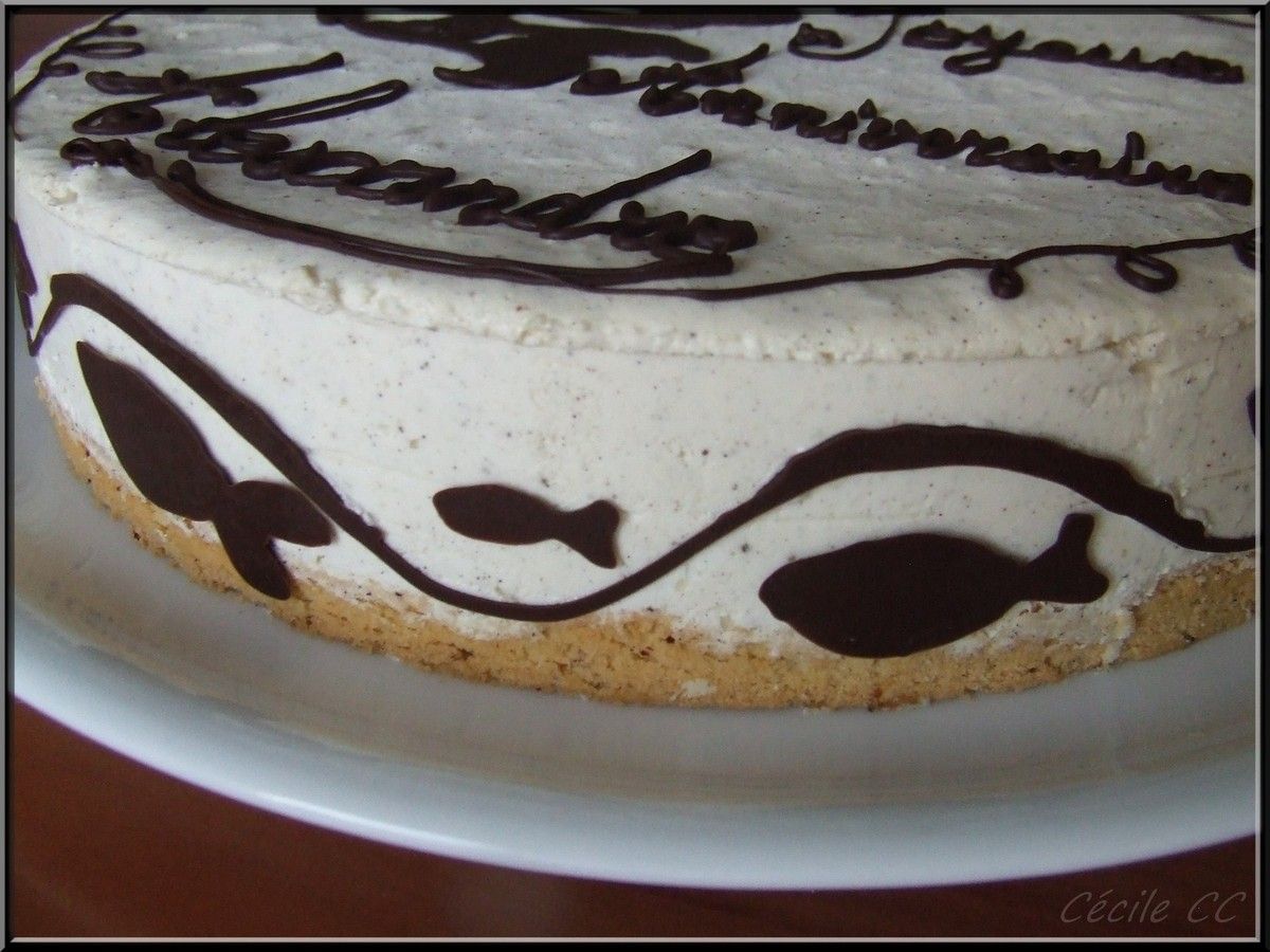 De mon côté, j'ai fais fondre du chocolat noir et j'ai fais une décoration au cornet. Prendre du rhodoïd pour le côté, faire un trait de chocolat ondulé d'un bout à l'autre puis dessiner des poissons en chocolat, laisser durcir un peu avant de venir placer le rhodoïd contre le gâteau. Pour le dessus, j'ai imprimé un dessin de poisson, dessus j'ai posé une feuille guitare et j'ai suivi les contours du modèle avec mon cornet de chocolat, j'ai attendu un peu que cela durcisse puis je l'ai posé sur le haut de l'entremet. L'inscription et les « bouis-bouis » qui font le tour sont réalisés à main levée. Placer l'entremet au frigo, attendre 15 à 30 min, le ressortir, enlever les rhodoïd et remettre immédiatement au frigo.