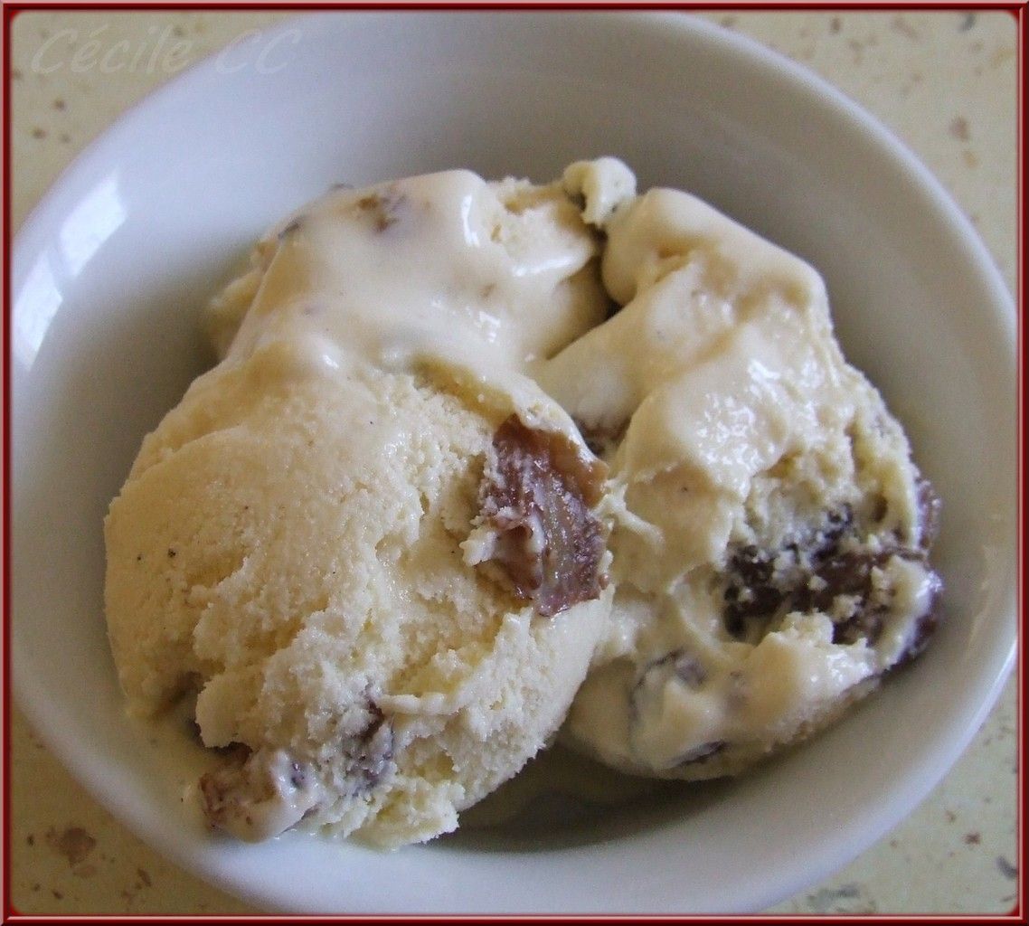 Verser dans la sorbetière, au bout de 30 minutes environ, ajouter les raisins secs égoutter. Quand votre glace est prête, la mettre en bac et au congélateur ou la consommer de suite.